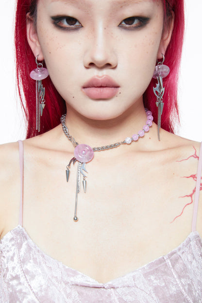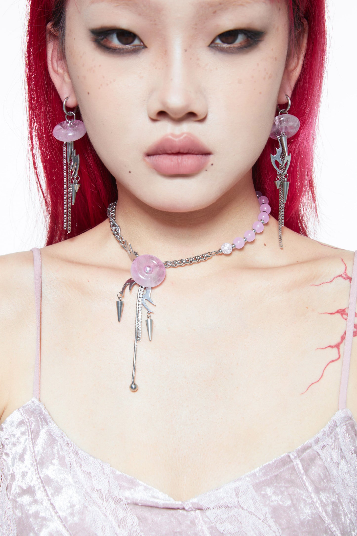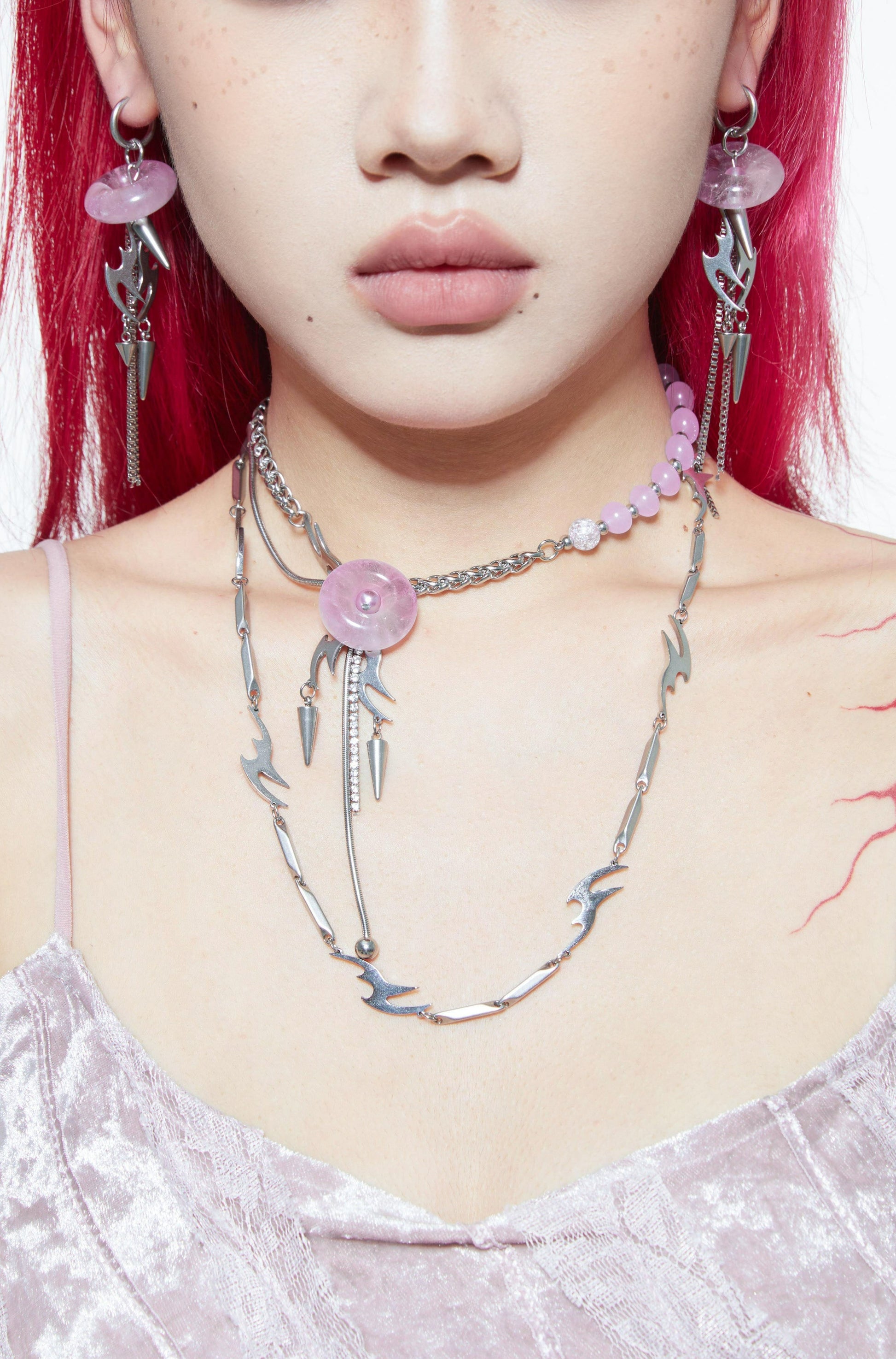 Beautiful piece, the color is a lovely pinkish purple. It's very unique and eye catching, but it's not bad taste. I've received a lot of compliments for this one! Quality is ok but, for the price, it could have been a little more sturdy (the pendants' links are a bit flimsy) ... And the photos are a bit misleading (the necklace looks bright pink in most of them, but it's actually more purple), but still a great purchase. Very satisfied!