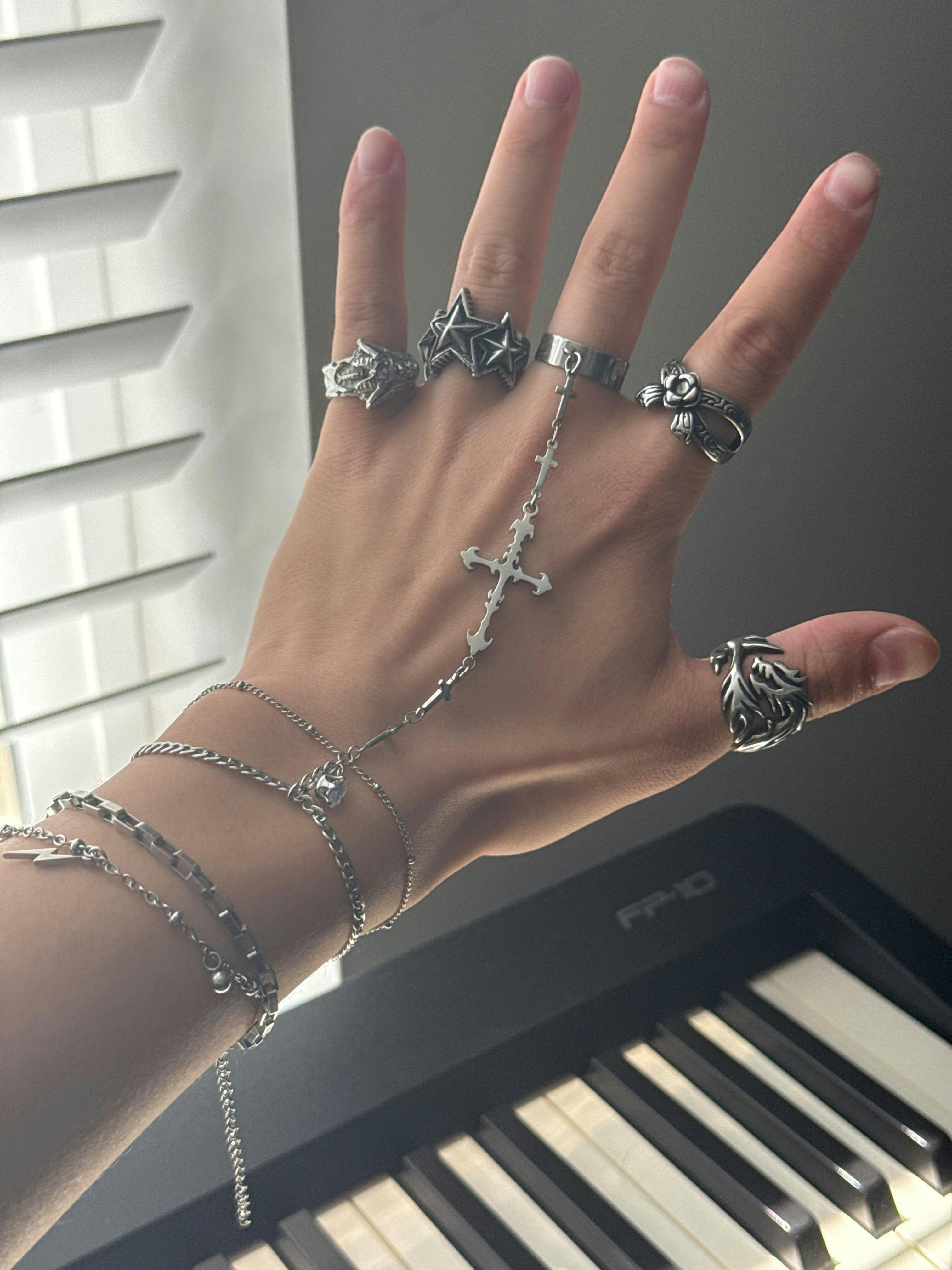 Fervooor Dune chrome heart lily crucifix hand chain ring+bracelet